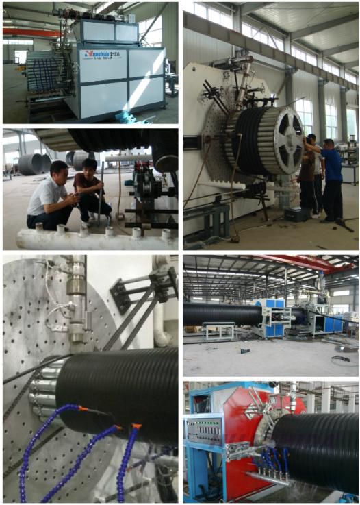 Uploading Raw material→ drying raw Material →Single screw extruding →spiral head mould→Calibrating hdpe strip size→Spray cooling HDPE strip →caterpillar traction pe strip→Single screw glue extruder →winder→winding roller forming→water cooler→cutter→pipe rack→finished production inspecting &packing.